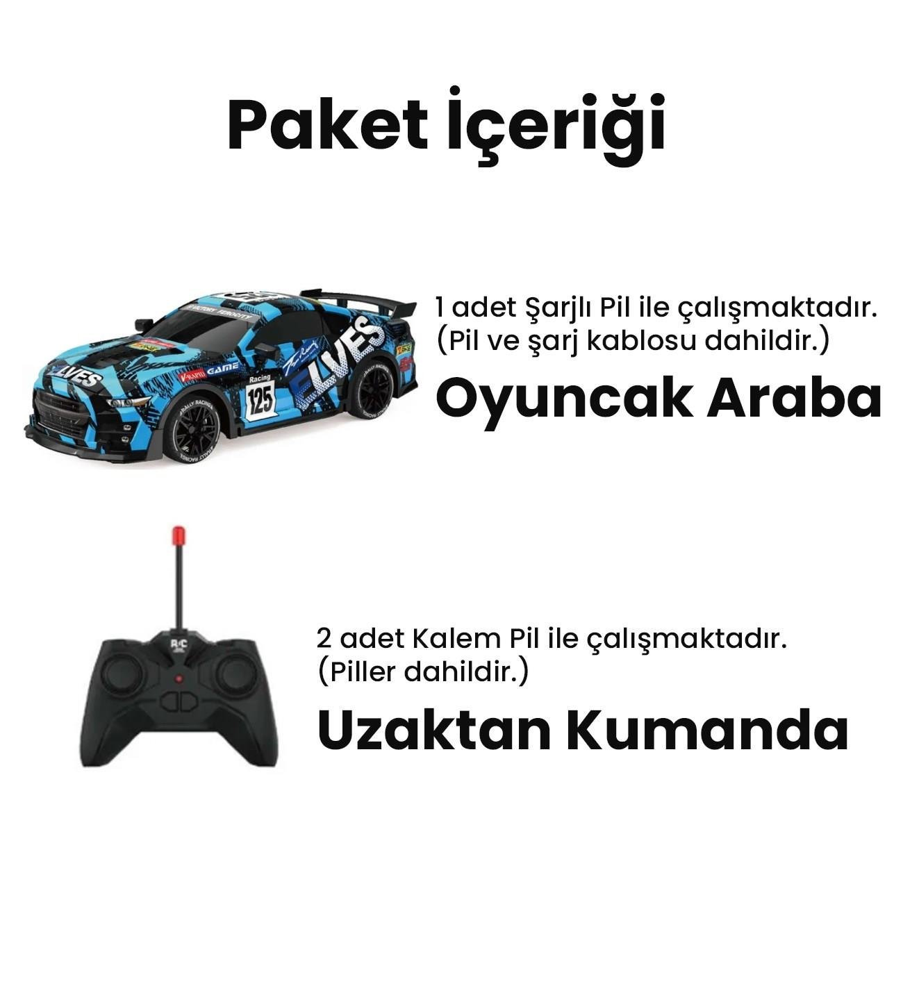 • Oyuncak araba şarjlı pil ile çalışır, uzun süreli kullanım sağlar.